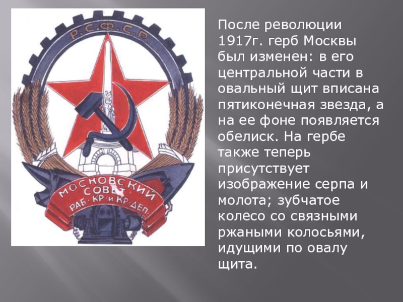 Слайд 18После революции 1917г. герб Москвы был изменен: в его центральной части