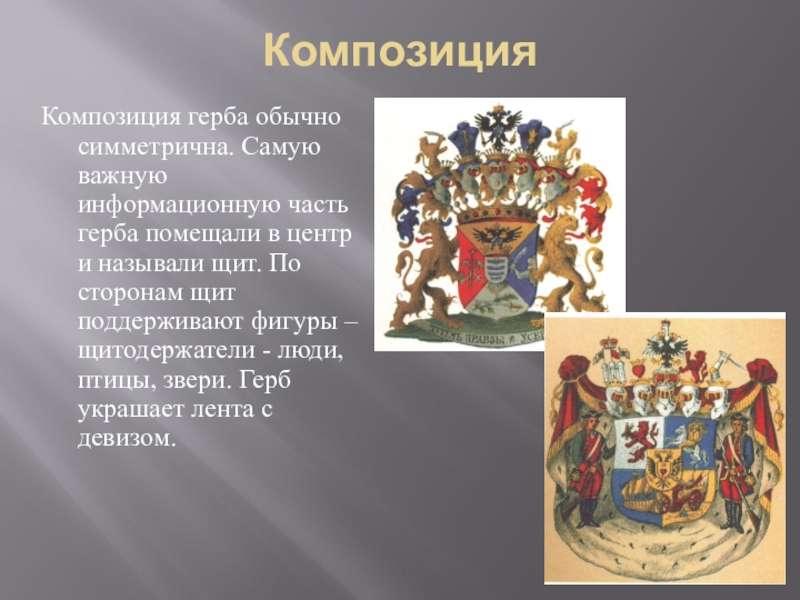 Композиция герба обычно симметрична. Самую важную информационную часть герба помещали в