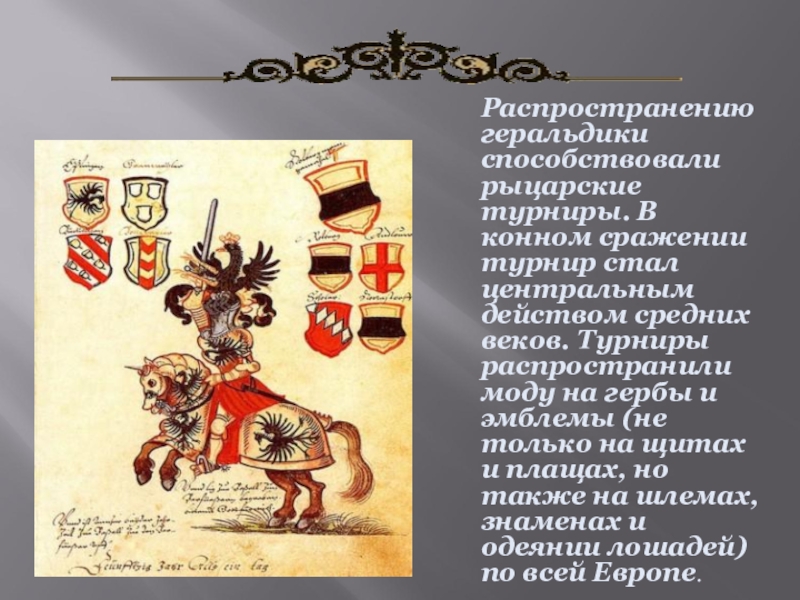 Слайд 10 Распространению геральдики способствовали рыцарские турниры. В конном