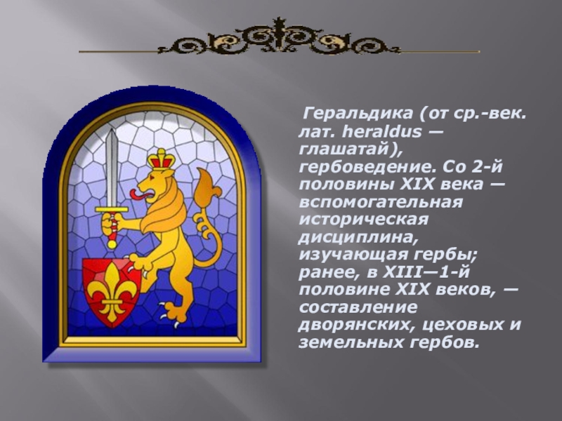 Слайд 9 Геральдика (от ср.-век. лат. heraldus — глашатай), гербоведение. Со 2-й половины
