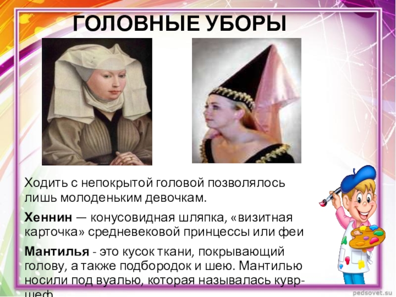 Характерный для того периода головной убор знатных дам, имевший форму конуса, покрытый вуалью.