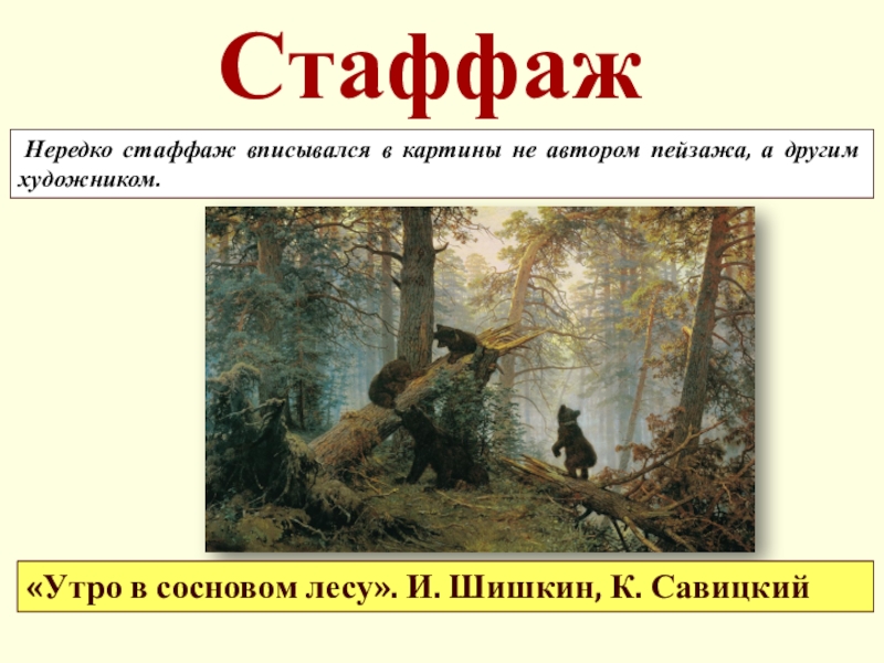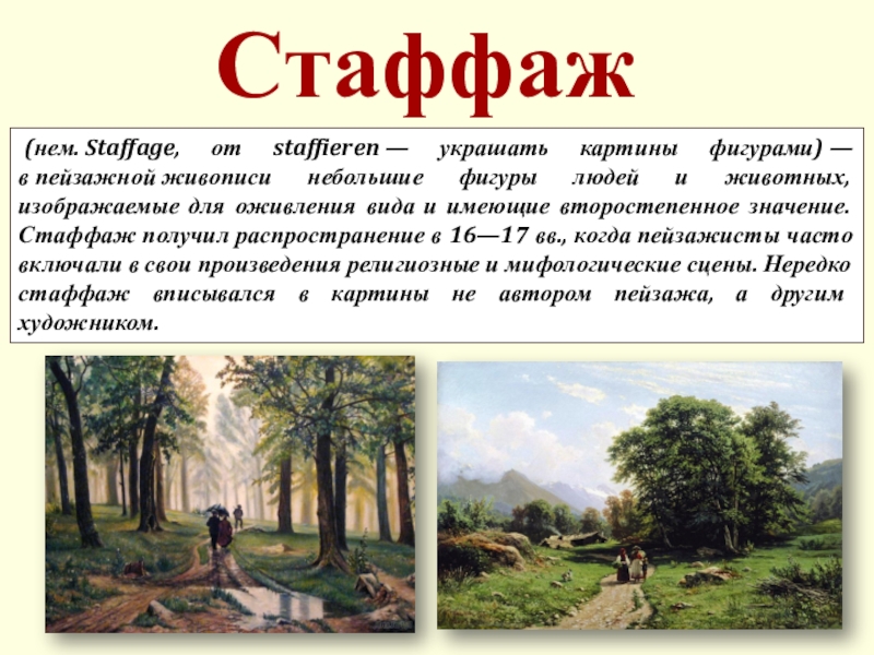 животных, изображаемые для оживления вида и имеющие второстепенное значение. Стаффаж получил распространение в 16—17 вв., когда пейзажисты часто включали в свои произведения религиозные и мифологические сцены. Нередко стаффаж вписывался в картины не автором пейзажа, а другим художником.