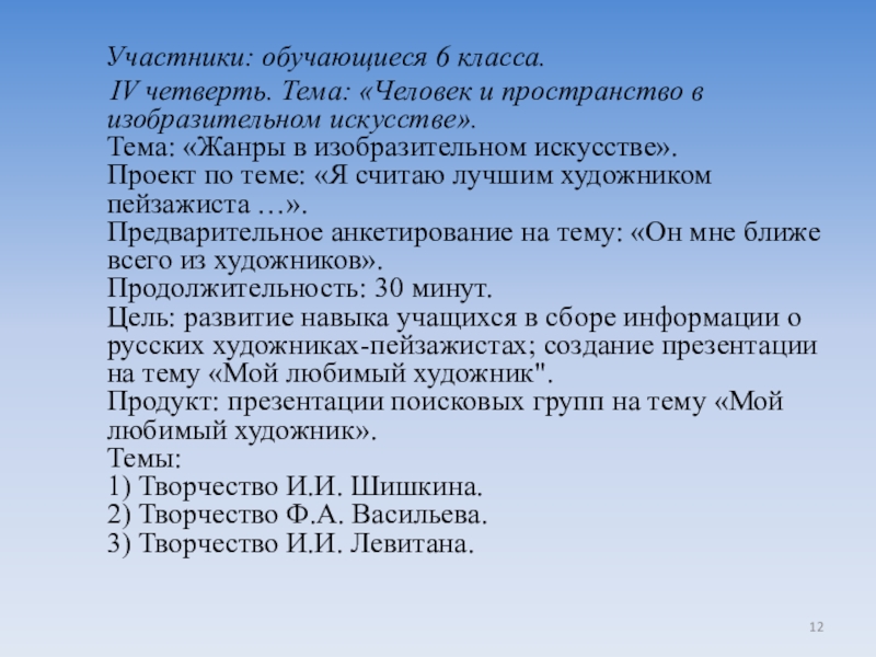 Цель: развитие навыка учащихся в сборе информации о русских художниках-пейзажистах; создание презентации на тему «Мой любимый художник".