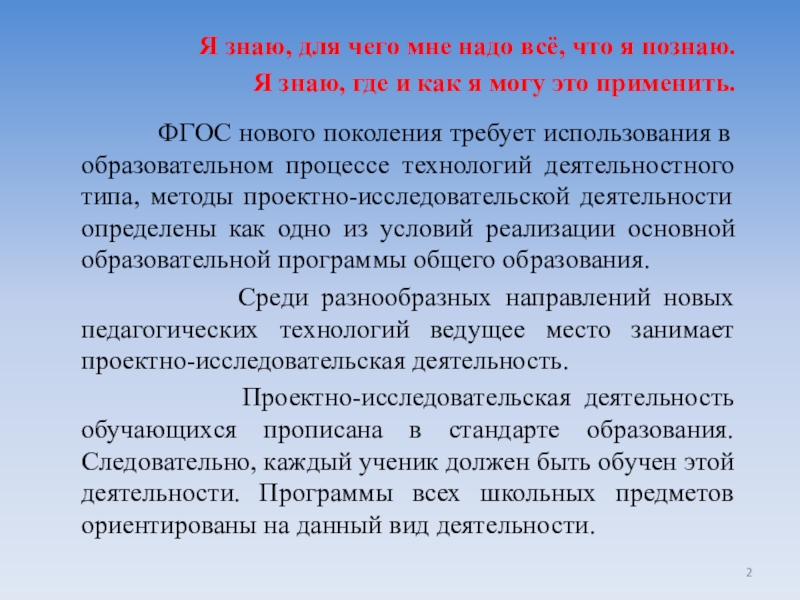 Слайд 2 Я знаю, для чего мне надо всё, что я познаю.
