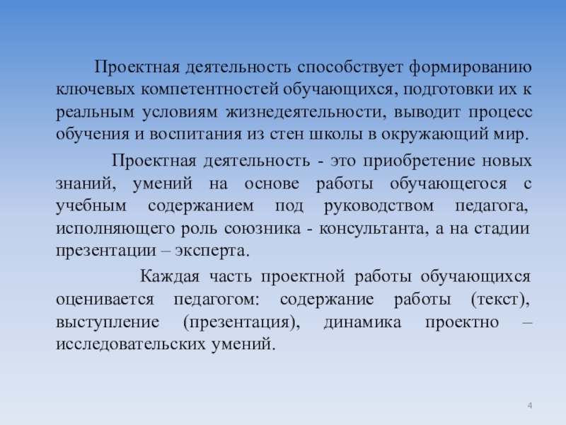 Слайд 4 Проектная деятельность способствует формированию ключевых
