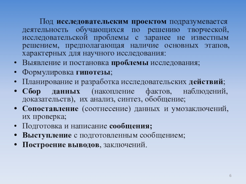 проектом подразумевается деятельность обучающихся по решению творческой, исследовательской проблемы с заранее не известным решением, предполагающая наличие основных этапов, характерных для научного исследования:
