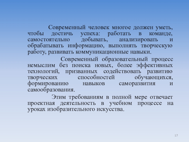 многое должен уметь, чтобы достичь успеха: работать в команде, самостоятельно добывать, анализировать и обрабатывать информацию, выполнять творческую работу, развивать коммуникационные навыки.
