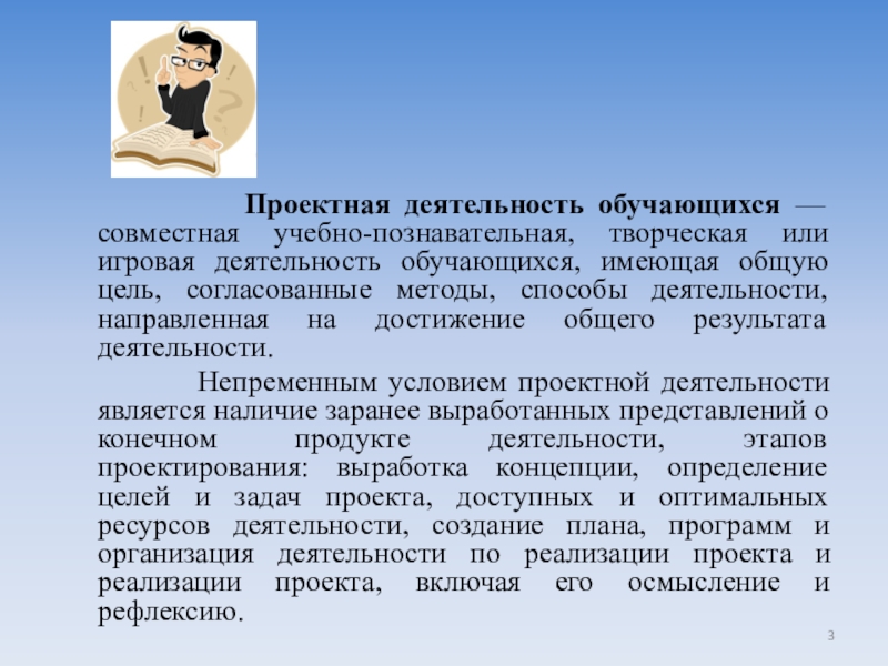 Проектная деятельность обучающихся — совместная учебно-познавательная, творческая или игровая деятельность обучающихся, имеющая общую цель, согласованные методы, способы деятельности, направленная на достижение общего результата деятельности.