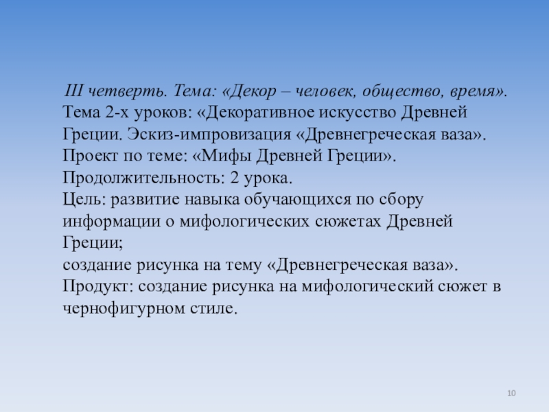 Слайд 10 III четверть. Тема: «Декор – человек, общество, время».