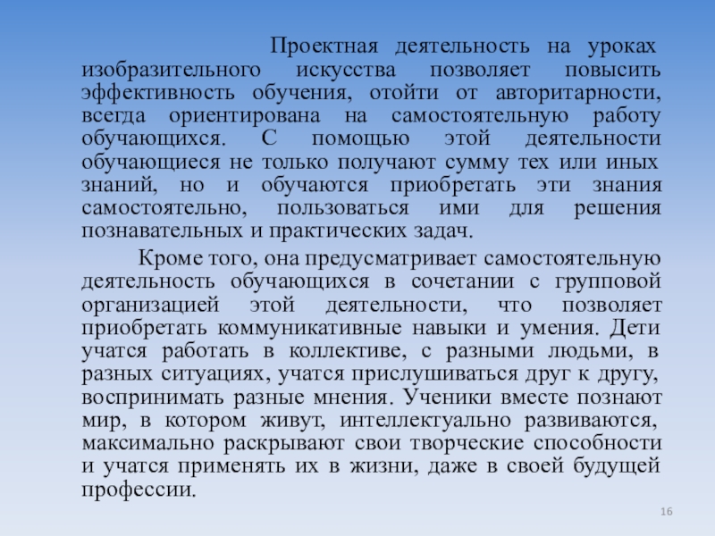 деятельность на уроках изобразительного искусства позволяет повысить эффективность обучения, отойти от авторитарности, всегда ориентирована на самостоятельную работу обучающихся. С помощью этой деятельности обучающиеся не только получают сумму тех или иных знаний, но и обучаются приобретать эти знания самостоятельно, пользоваться ими для решения познавательных и практических задач.