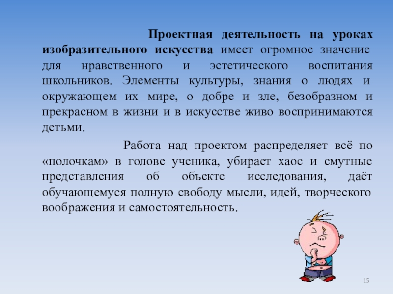 Работа над проектом распределяет всё по «полочкам» в голове ученика, убирает хаос и смутные представления об объекте исследования, даёт обучающемуся полную свободу мысли, идей, творческого воображения и самостоятельность.