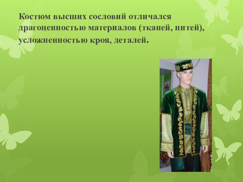 Слайд 14Костюм высших сословий отличался драгоценностью материалов (тканей, нитей), усложненностью кроя, деталей.