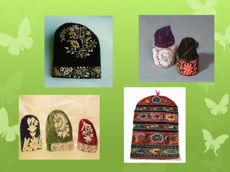 Бархатные калфаки разных размеров и цвета украшались орнаментами золотошвейной вышивкой, но и шитьем жемчугом, бисером, аппликацией и т.д.