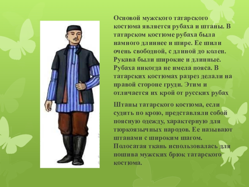 Слайд 3Основой мужского татарского костюма является рубаха и штаны. В татарском костюме