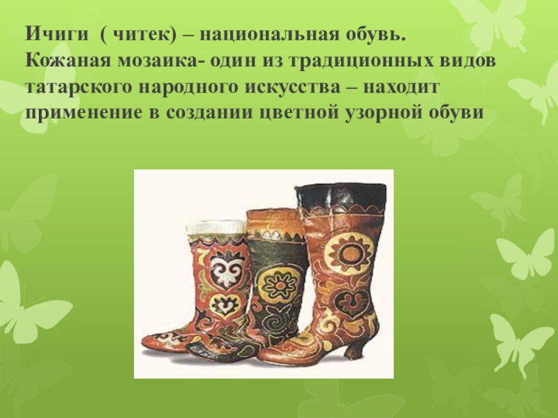 Ичиги ( читек) – национальная обувь.	 Кожаная мозаика- один из традиционных видов татарского народного искусства – находит