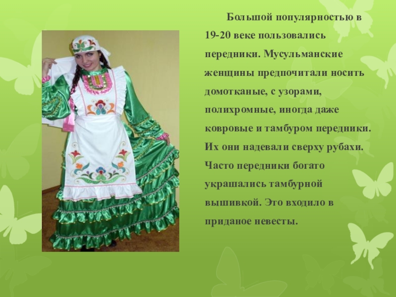 Слайд 4 Большой популярностью в 19-20 веке пользовались передники.