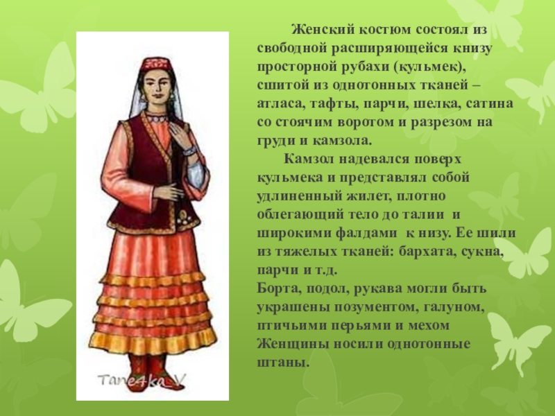 книзу просторной рубахи (кульмек), сшитой из однотонных тканей –атласа, тафты, парчи, шелка, сатина со стоячим воротом и разрезом на груди и камзола. Камзол надевался поверх кульмека и представлял собой удлиненный жилет, плотно облегающий тело до талии и широкими фалдами к низу. Ее шили из тяжелых тканей: бархата, сукна, парчи и т.д. Борта, подол, рукава могли быть украшены позументом, галуном, птичьими перьями и мехом Женщины носили однотонные штаны.
