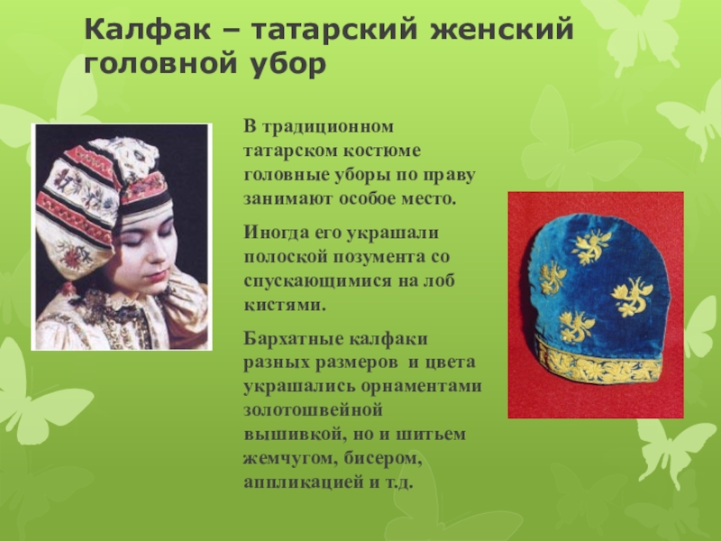 Калфак – татарский женский   головной убор В традиционном татарском костюме головные уборы по праву занимают