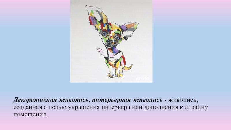 Слайд 13Декоративная живопись, интерьерная живопись - живопись, созданная с целью украшения интерьера
