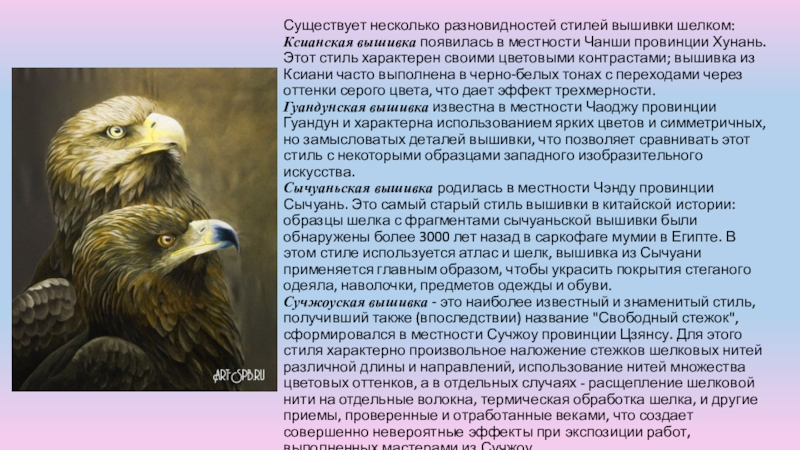 Сучжоуская вышивка - это наиболее известный и знаменитый стиль, получивший также (впоследствии) название "Свободный стежок", сформировался в местности Сучжоу провинции Цзянсу. Для этого стиля характерно произвольное наложение стежков шелковых нитей различной длины и направлений, использование нитей множества цветовых оттенков, а в отдельных случаях - расщепление шелковой нити на отдельные волокна, термическая обработка шелка, и другие приемы, проверенные и отработанные веками, что создает совершенно невероятные эффекты при экспозиции работ, выполненных мастерами из Сучжоу.