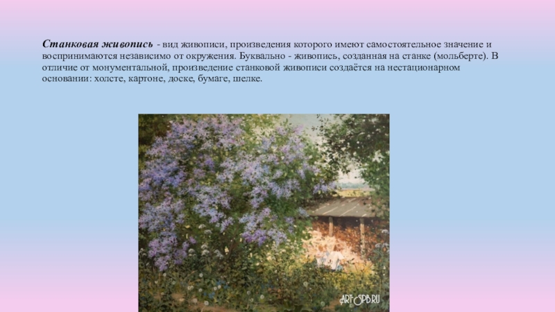 Слайд 14Станковая живопись - вид живописи, произведения которого имеют самостоятельное значение и