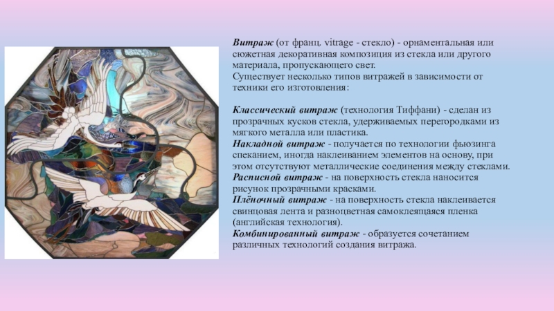 Комбинированный витраж - образуется сочетанием различных технологий создания витража.