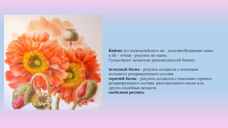 Слайд 5Батик (от индонезийского ва - хлопчатобумажная ткань и tik - точка)
