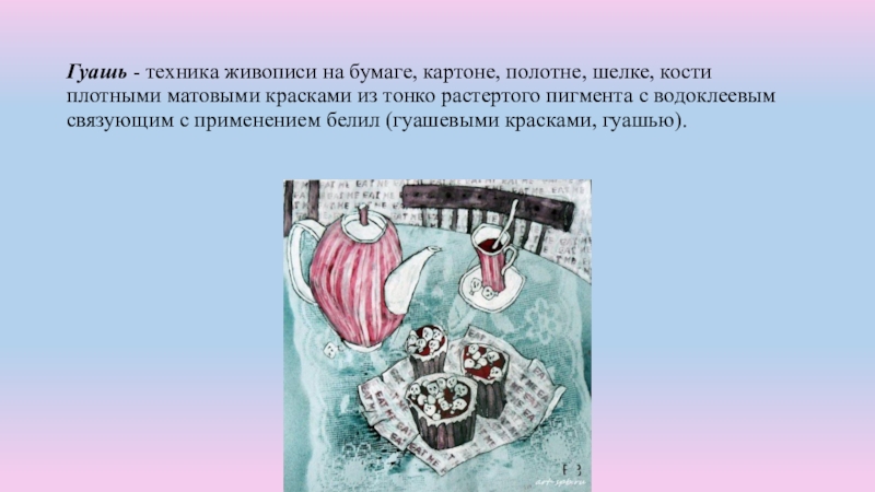 Слайд 12Гуашь - техника живописи на бумаге, картоне, полотне, шелке, кости плотными