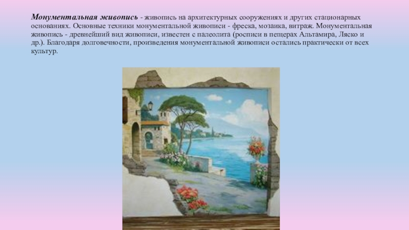 Слайд 15Монументальная живопись - живопись на архитектурных сооружениях и других стационарных основаниях.