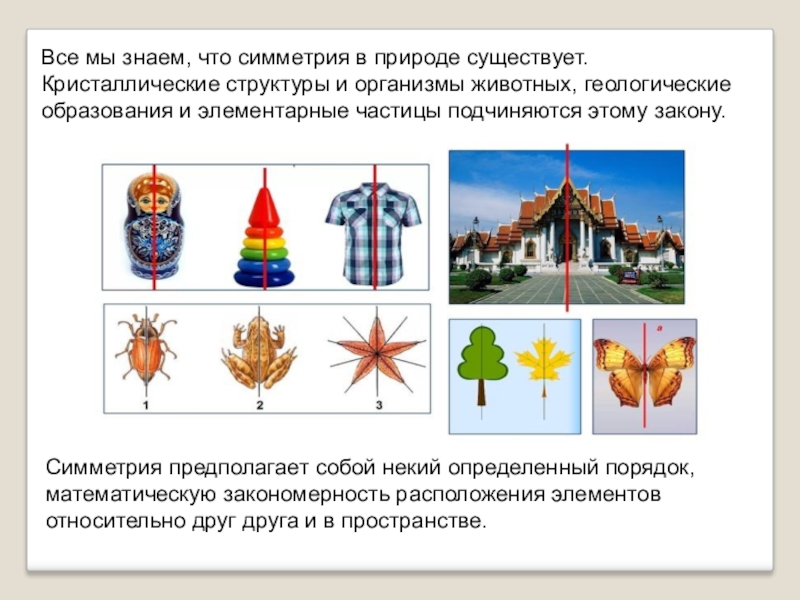 Симметрия предполагает собой некий определенный порядок, математическую закономерность расположения элементов относительно друг друга и в пространстве.