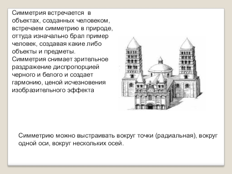 Симметрию можно выстраивать вокруг точки (радиальная), вокруг одной оси, вокруг нескольких осей.
