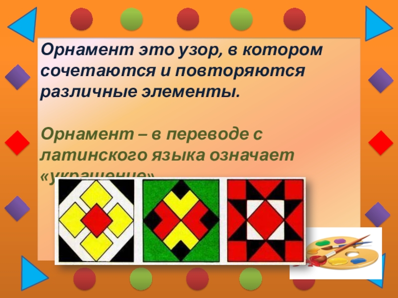 Орнамент это узор, в котором сочетаются и повторяются   различные элементы. Орнамент – в переводе с латинского языка означает «украшение».