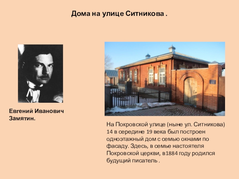 ул. Ситникова) 14 в середине 19 века был построен одноэтажный дом с семью окнами по фасаду. Здесь, в семье настоятеля Покровской церкви, в1884 году родился будущий писатель .