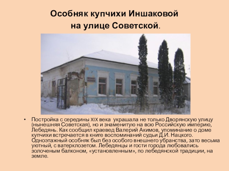 не только Дворянскую улицу (нынешняя Советская), но и знаменитую на всю Российскую империю, Лебедянь. Как сообщил краевед Валерий Акимов, упоминание о доме купчихи встречается в книге воспоминаний судьи Д.И. Нацкого. Одноэтажный особняк был без особого внешнего убранства, зато весьма уютный, с ватерклозетом. Лебедянцы и гости города любовались золоченым балконом, «установленным», по лебедянской традиции, на земле.
