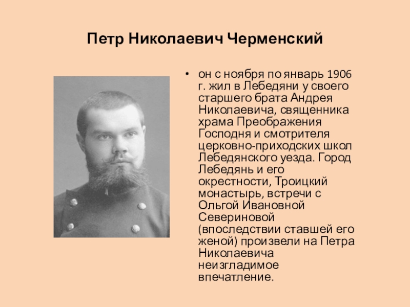 в Лебедяни у своего старшего брата Андрея Николаевича, священника храма Преображения Господня и смотрителя церковно-приходских школ Лебедянского уезда. Город Лебедянь и его окрестности, Троицкий монастырь, встречи с Ольгой Ивановной Севериновой (впоследствии ставшей его женой) произвели на Петра Николаевича неизгладимое впечатление.