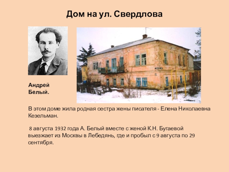 8 августа 1932 года А. Белый вместе с женой К.Н. Бугаевой выезжает из Москвы в Лебедянь, где и пробыл с 9 августа по 29 сентября.
