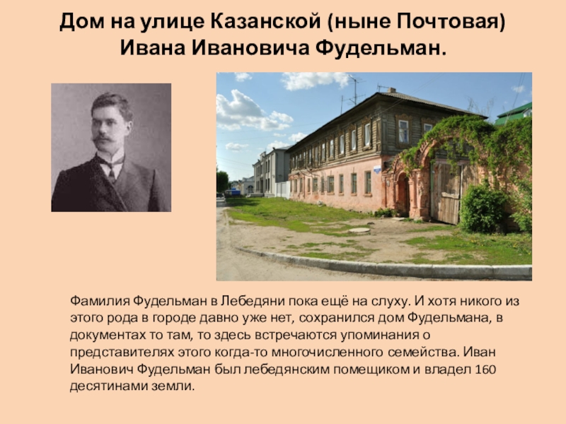 Фудельман в Лебедяни пока ещё на слуху. И хотя никого из этого рода в городе давно уже нет, сохранился дом Фудельмана, в документах то там, то здесь встречаются упоминания о представителях этого когда-то многочисленного семейства. Иван Иванович Фудельман был лебедянским помещиком и владел 160 десятинами земли.