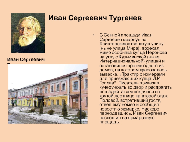 улицу (ныне улица Мира), проехал, мимо особняка купца Неронова на углу с Кузьминской (ныне Интернациональной) улицей и остановился против одного из домов, на котором красовалась вывеска: «Трактир с номерами для приезжающих купца И.И. Голева". Писатель приказал кучеру ехать во двор и распрягать лошадей, а сам поднялся по крутой лестнице на второй этаж. Половой, встретивший гостя, отвел ему номер и сообщил новости о ярмарке. Наскоро переодевшись, Иван Сергеевич поспешил на ярмарочную площадь.