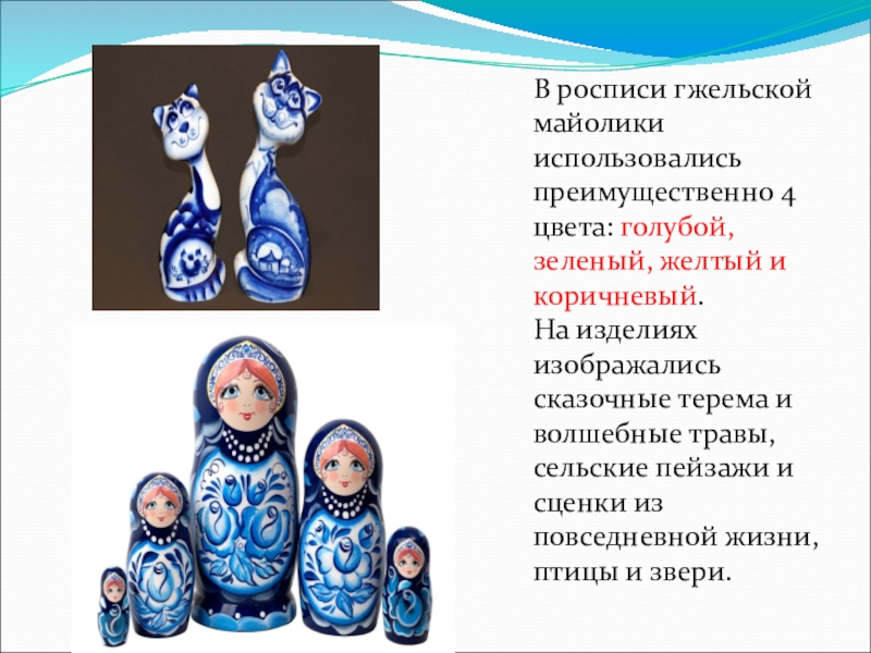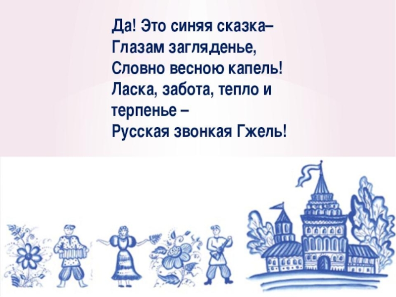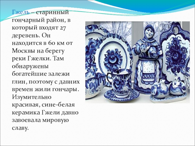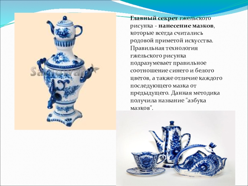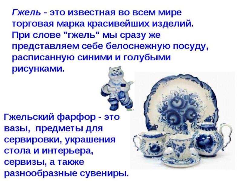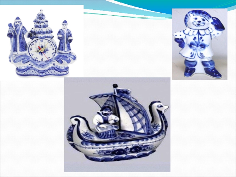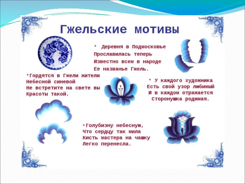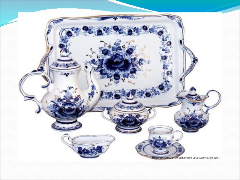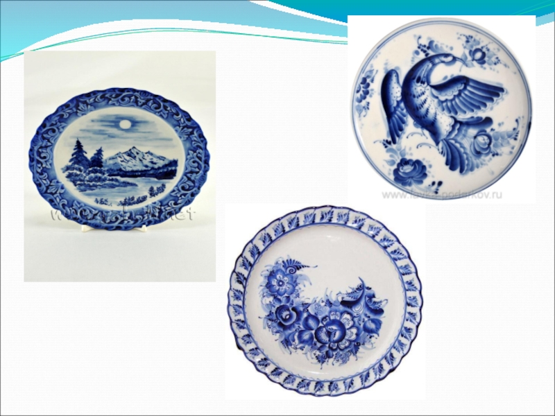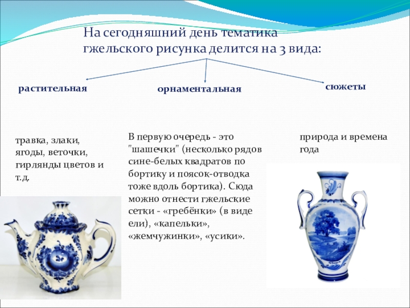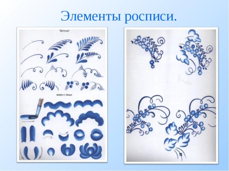 В первую очередь - это "шашечки" (несколько рядов сине-белых квадратов по бортику и поясок-отводка тоже вдоль бортика). Сюда можно отнести гжельские сетки - «гребёнки» (в виде ели), «капельки», «жемчужинки», «усики».