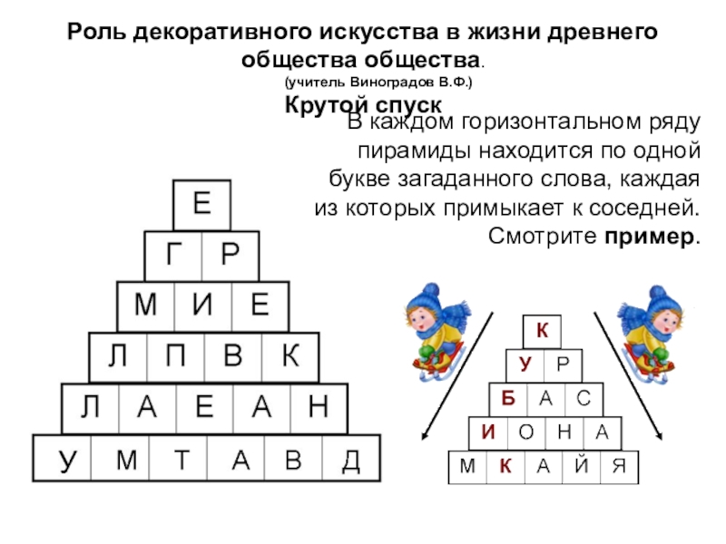 В каждом горизонтальном ряду пирамиды находится по одной букве загаданного слова, каждая из которых примыкает к соседней.
