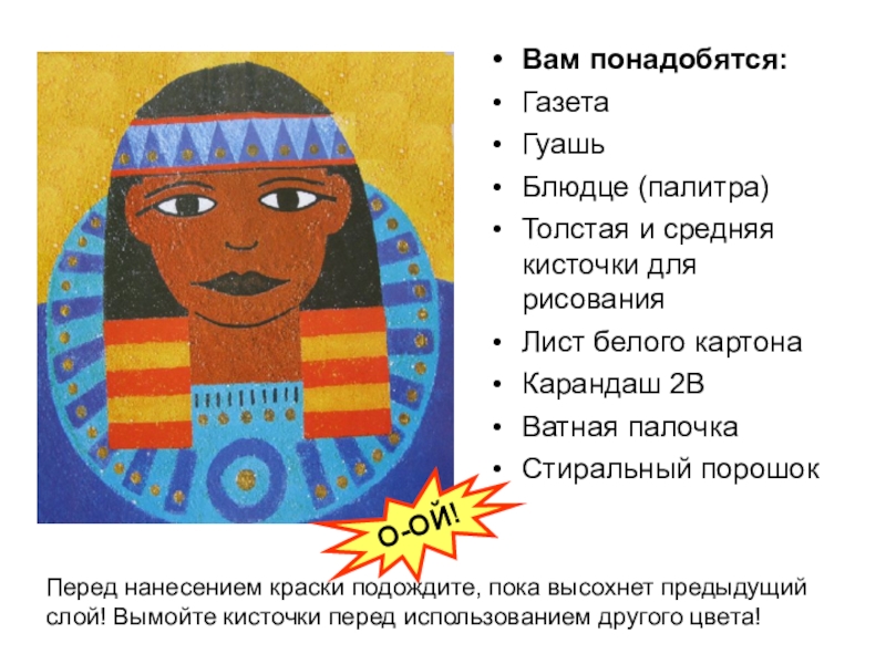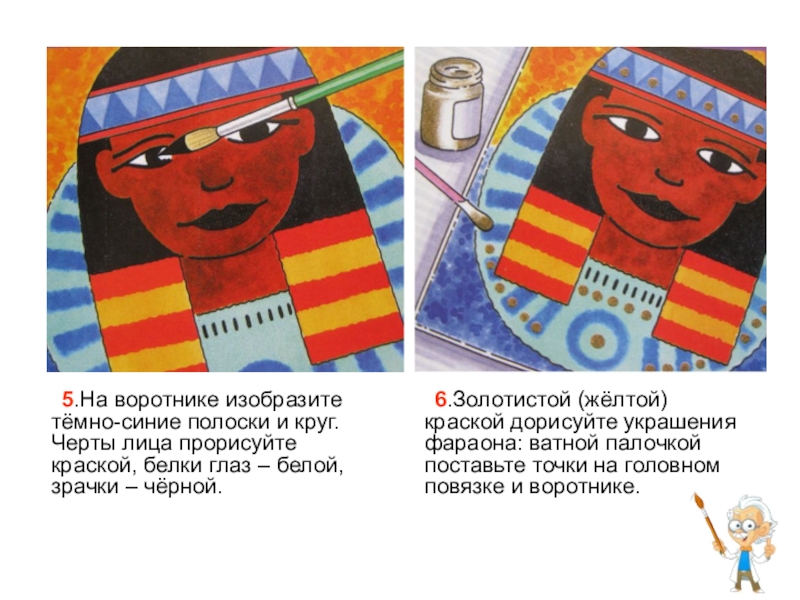 6.Золотистой (жёлтой) краской дорисуйте украшения фараона: ватной палочкой поставьте точки на головном повязке и воротнике.