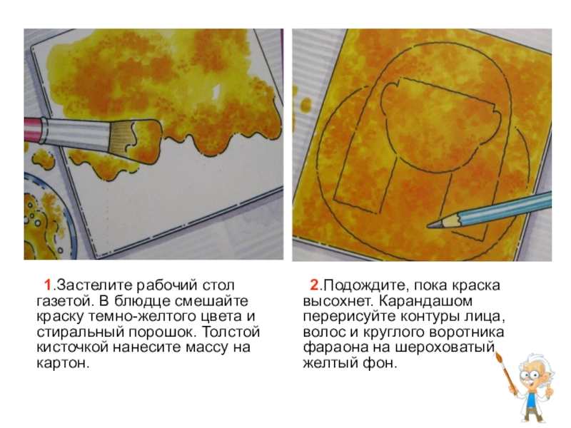 2.Подождите, пока краска высохнет. Карандашом перерисуйте контуры лица, волос и круглого воротника фараона на шероховатый желтый фон.