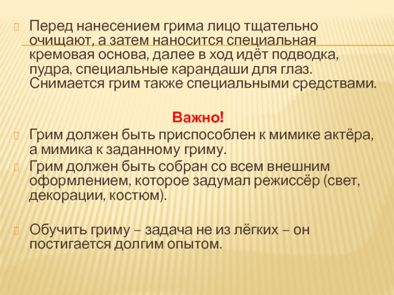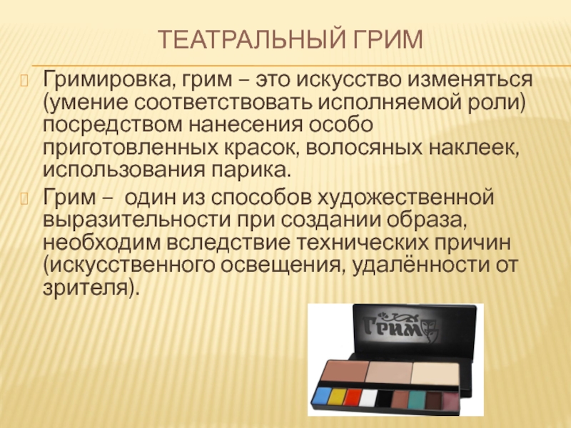 Грим – один из способов художественной выразительности при создании образа, необходим вследствие технических причин (искусственного освещения, удалённости от зрителя).