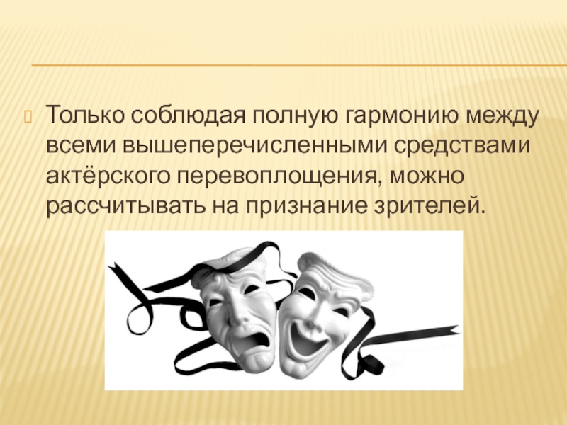 Слайд 20Только соблюдая полную гармонию между всеми вышеперечисленными средствами актёрского перевоплощения, можно