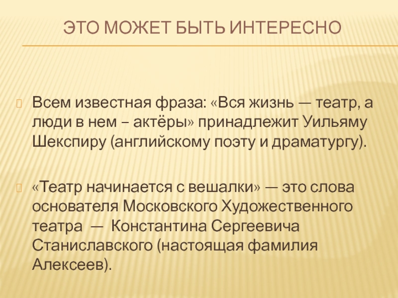 «Театр начинается с вешалки» — это слова основателя Московского Художественного театра — Константина Сергеевича Станиславского (настоящая фамилия Алексеев).