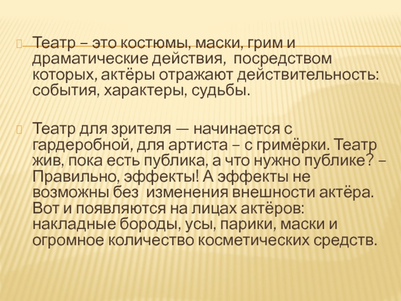 Слайд 4Театр – это костюмы, маски, грим и драматические действия, посредством которых,