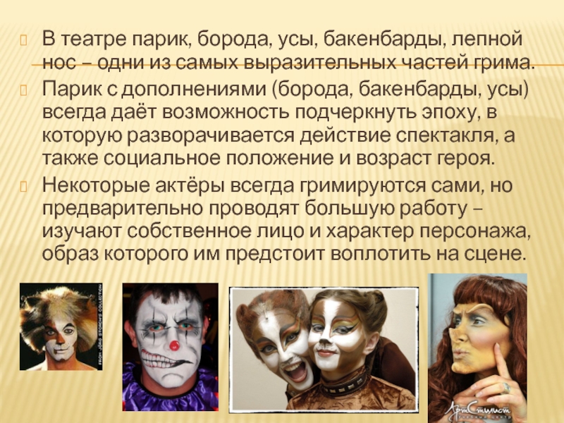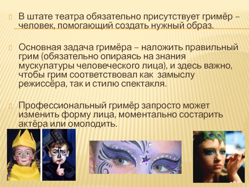 Слайд 13В штате театра обязательно присутствует гримёр – человек, помогающий создать нужный
