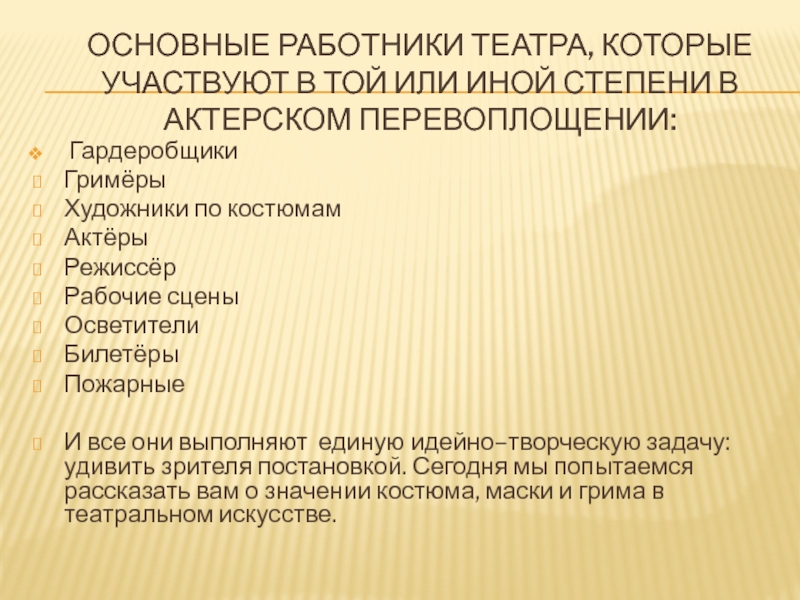 Слайд 5Основные работники театра, которые участвуют в той или иной степени в