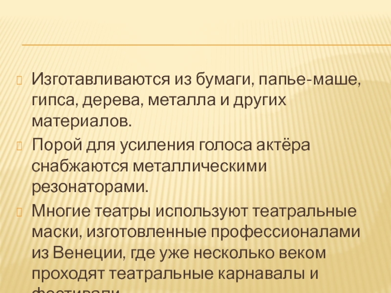 Многие театры используют театральные маски, изготовленные профессионалами из Венеции, где уже несколько веком проходят театральные карнавалы и фестивали.