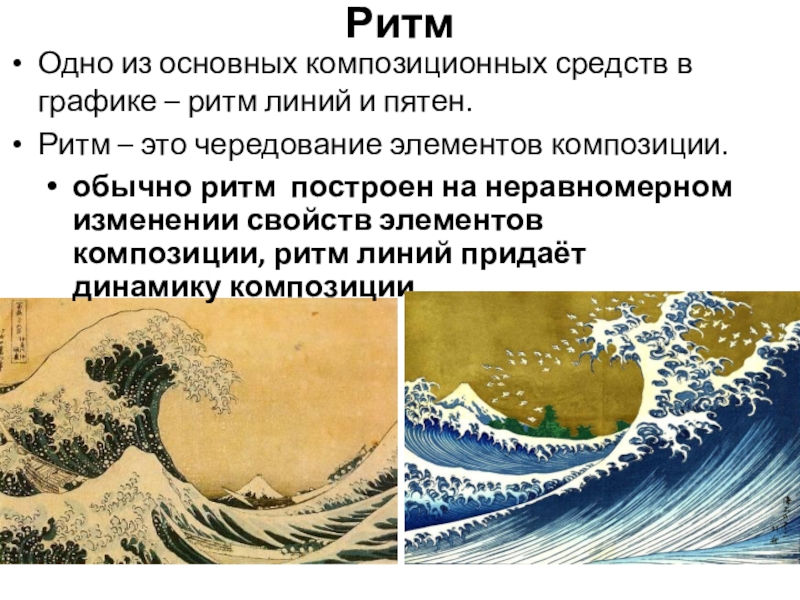 обычно ритм построен на неравномерном изменении свойств элементов композиции, ритм линий придаёт динамику композиции